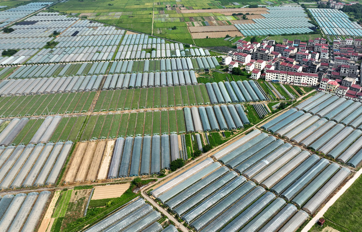 這是位于江西省高安市上湖鄉的高安富硒辣椒產業園蔬菜大棚(7月7日攝)(無人機照片)。 新華社記者 萬象 攝