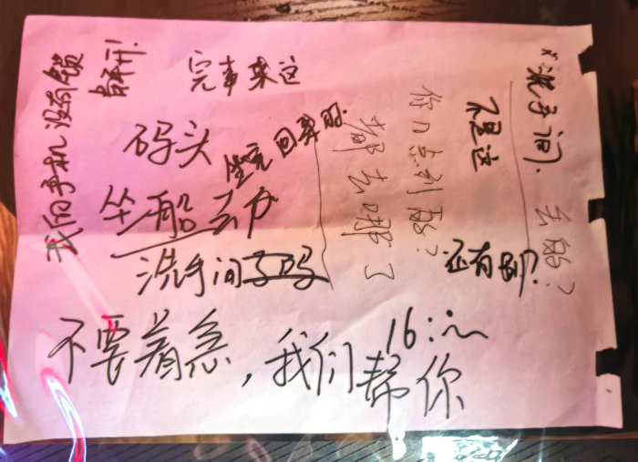 在派出所的一個記錄本里里,記者翻到了一張便簽紙,上面的兩種筆跡,似乎是寫了兩個人的對話?!澳銕c到的?都去哪了?在洗手間丟的?不要著急,我們幫你”。