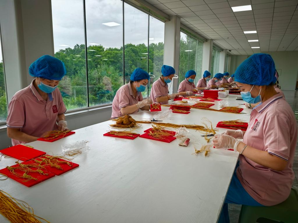 在吉林博大農林生物科技有限公司,工人們對人參進行分揀(7月15日攝)。新華社記者 張博宇 攝