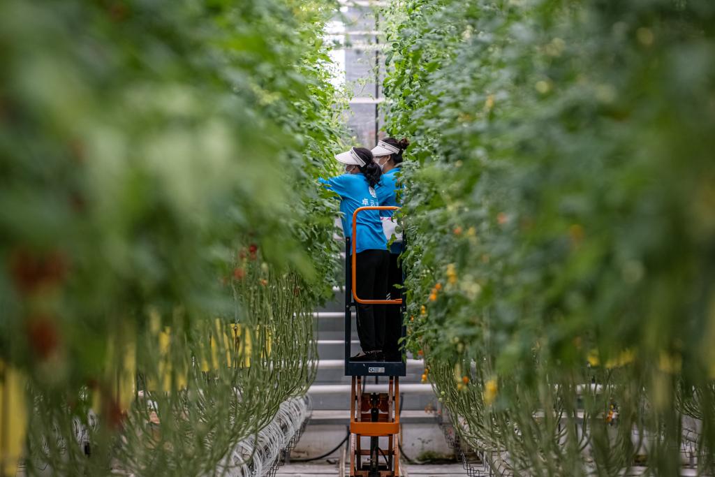 在吉林卓遠農業發展有限公司的“植物工廠”內,員工正在采摘成熟的水果番茄(7月15日攝)。新華社記者 邵澤東 攝