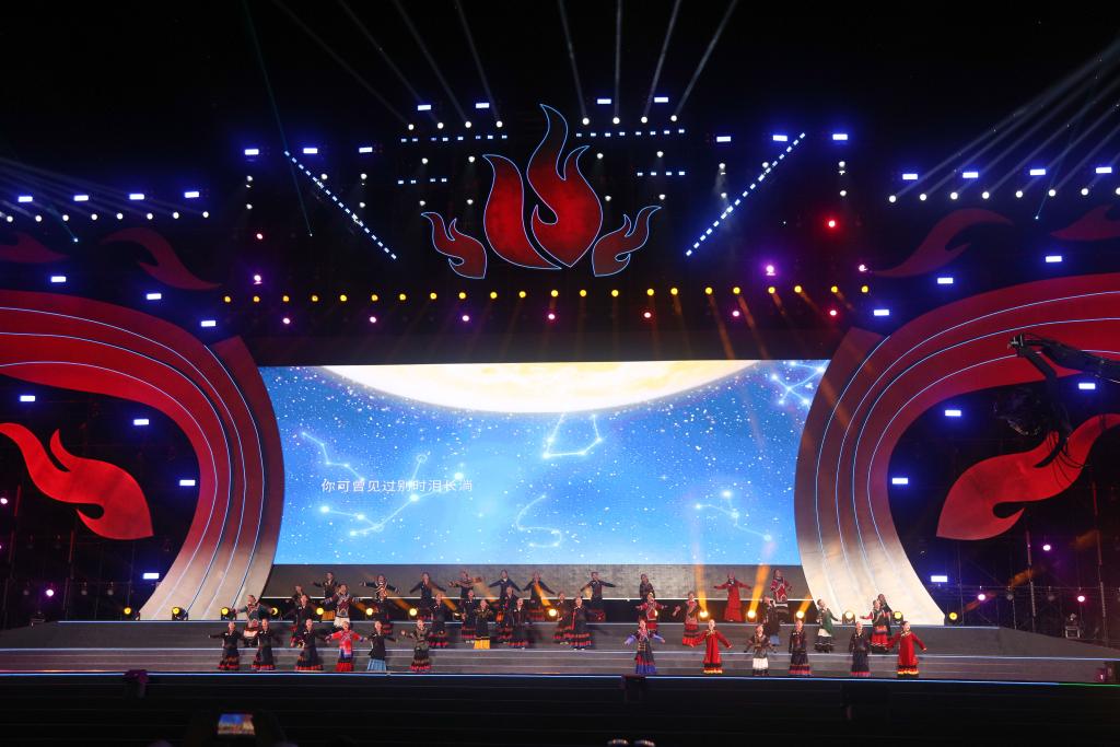 來自涼山州普格縣的妞妞合唱團在2025年涼山彝族火把節開幕式上演唱《玉盤》。新華社記者 尹恒 攝