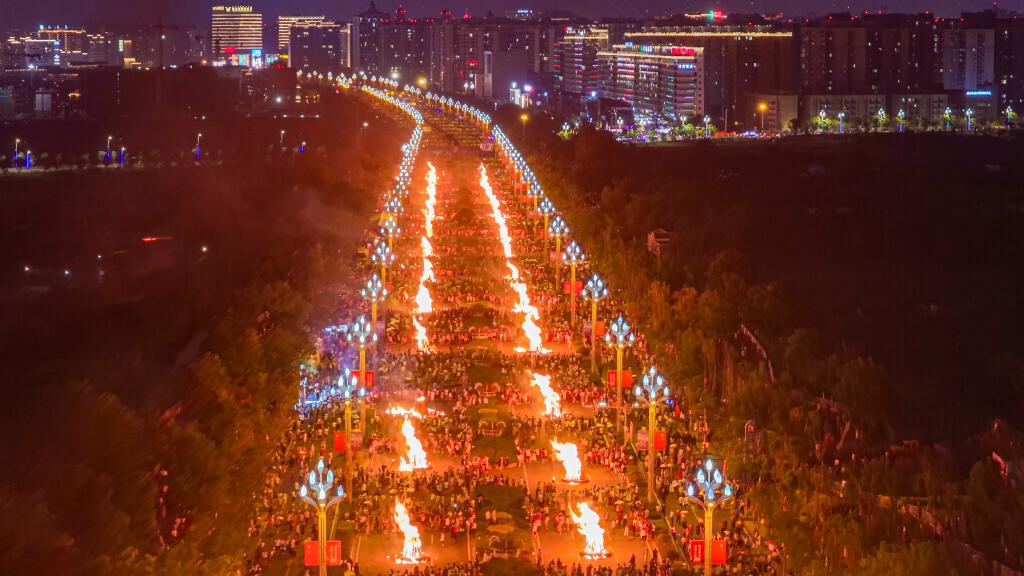 在西昌市航天大道,88個火堆同時點燃(無人機照片)。新華社發