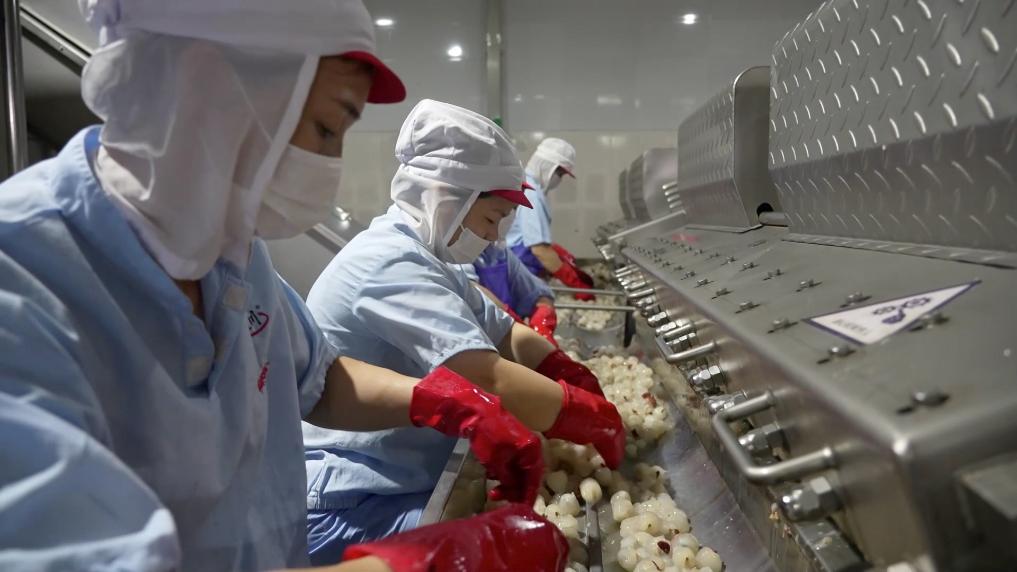 當地食品加工企業也積極響應,增設收購點擴大收儲。漳浦縣達川食品工業有限公司車間內,一部分荔枝經清洗、消毒、密封后被冷凍保存,用于深加工;另一部分經篩選、去皮、去核等工序后,制成荔枝原漿。公司負責人表示,其現有生產線每日僅能加工鮮果310噸,為此,公司委托漳州市龍海區、漳州高新區等周邊區域廠家聯合生產,將每日鮮果加工能力提高到了800多噸。