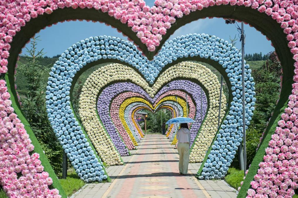 7月22日,在青海省大通縣邊麻溝花海景區,一名游客經過鮮花長廊。新華社記者 孫瑞博 攝