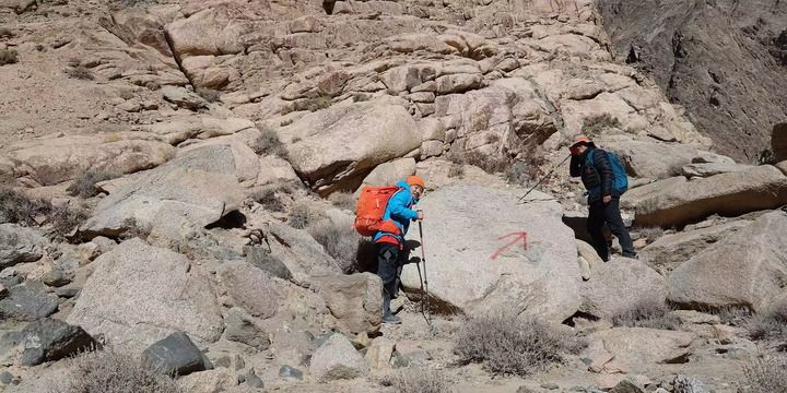 為驗證猜想,田才讓和鄧李才團隊決定爬上賽什騰山一探究竟。陡峭的山體、風化易碎的坡面不僅難以攀爬,而且方向難辨。他們背著自噴漆反復勘探,標記出了一條上山路線。