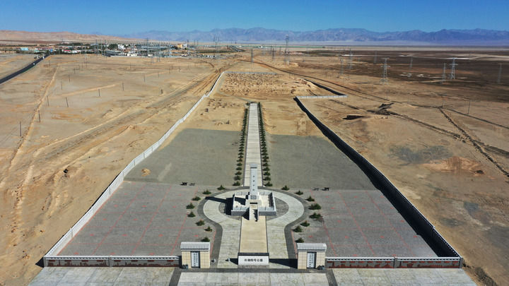在冷湖鎮東南方向,一座高聳的紀念碑引人注目。這里是冷湖四號公墓,長眠著自青海油田開發以來,因公、因病去世的400多位油田職工及家屬。他們把“愛國、創業、奉獻、實干”鐫刻在豐碑之上。