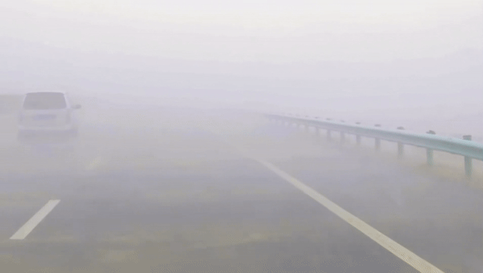 汽車像得了瘧疾,隨著狂風一陣陣打擺子。整個公路都被黃色吞沒,只剩下模模糊糊的白色車道線。司機躬著身子,像趴在方向盤上一樣,瞪著眼睛盯著前方,頭快要抵到前風擋玻璃了。