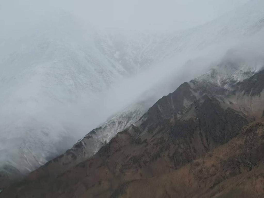半個小時之后,風勢在幾滴雨點的打擊下,漸漸緩和下來。當沙幕隱去,露出被磨洗過的藍天時,我們都長舒了一口氣。擋風玻璃上的兩側,裹了厚厚一層泥巴。遠處的山峰頂上,白雪在太陽的余暉下,染成了金黃。