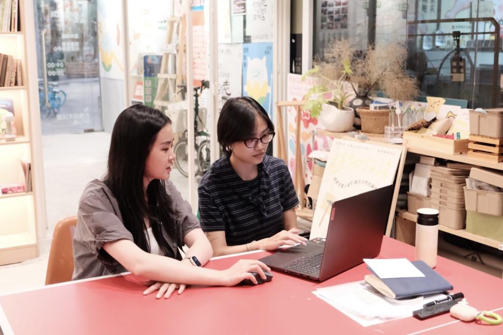 圖為楊迎琦(左)和馮欣雨(右)在菜市書屋里討論下一場活動選題。新華社記者 張雅雯 攝