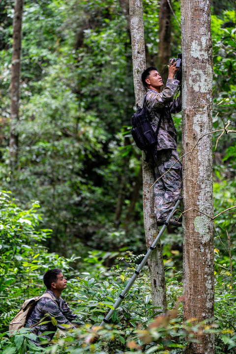 在云南省西雙版納州景洪市大渡崗鄉,亞洲象監測員許團明(上)和李紅江查看保護區亞洲象活動區域紅外相機監測情況(8月10日攝)。