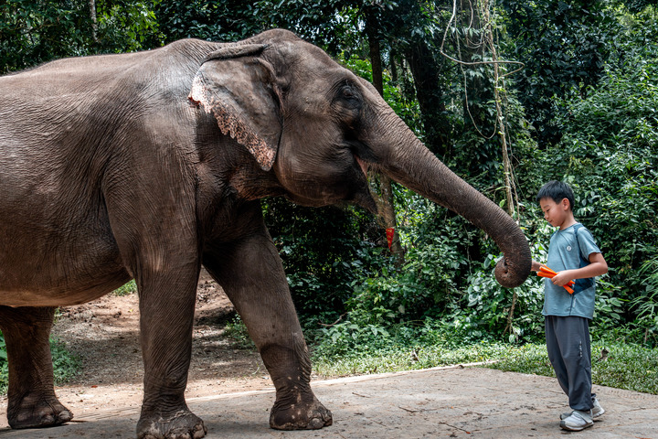 一名參加研學活動的男孩在野象谷給大象喂食胡蘿卜(8月10日攝)。