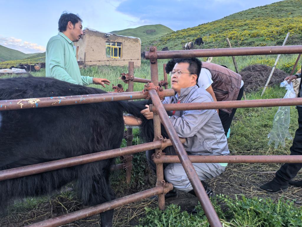 潘陽陽正在檢查牦牛狀況(2025年7月攝)。(受訪者供圖)