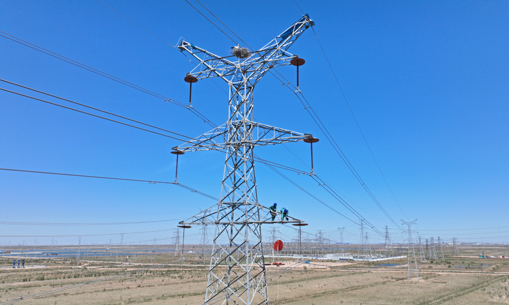 國網東營供電公司工作人員為輸電線路安裝絕緣防鳥罩。新華社發