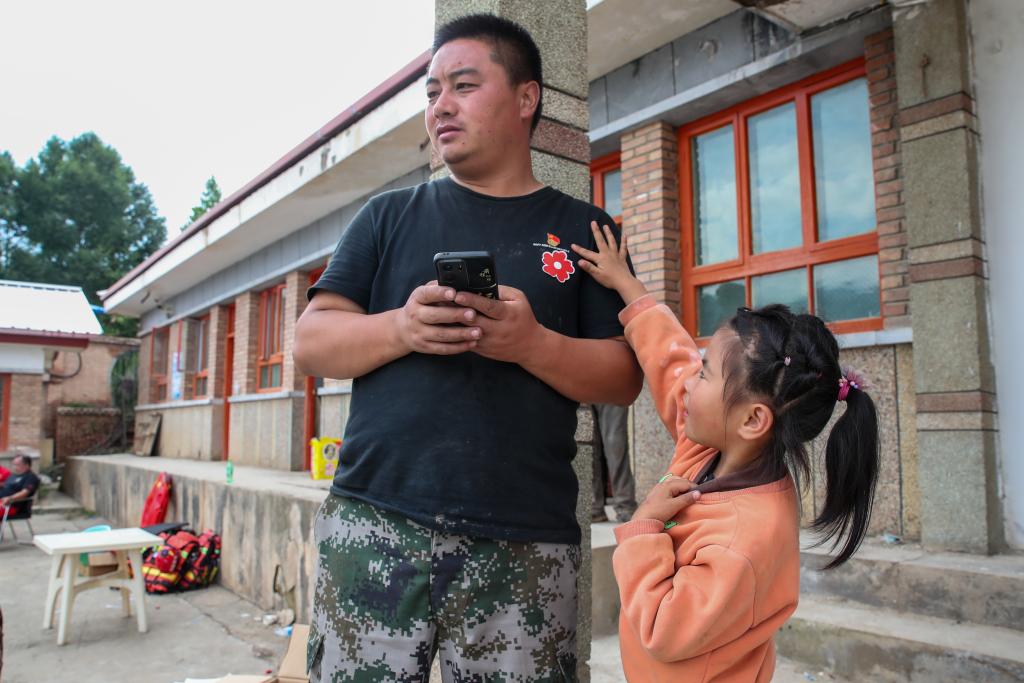 8月10日,在榆中縣馬坡鄉上莊村臨時安置點,一個小女孩將一朵小紅花貼在陳萬凱胸前。新華社記者 郎兵兵 攝