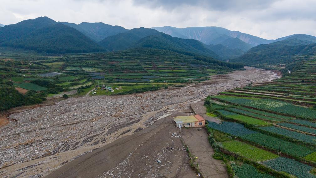 這是8月10日在榆中縣馬坡鄉上莊村拍攝的山洪災害現場(無人機照片)。新華社記者 郎兵兵 攝