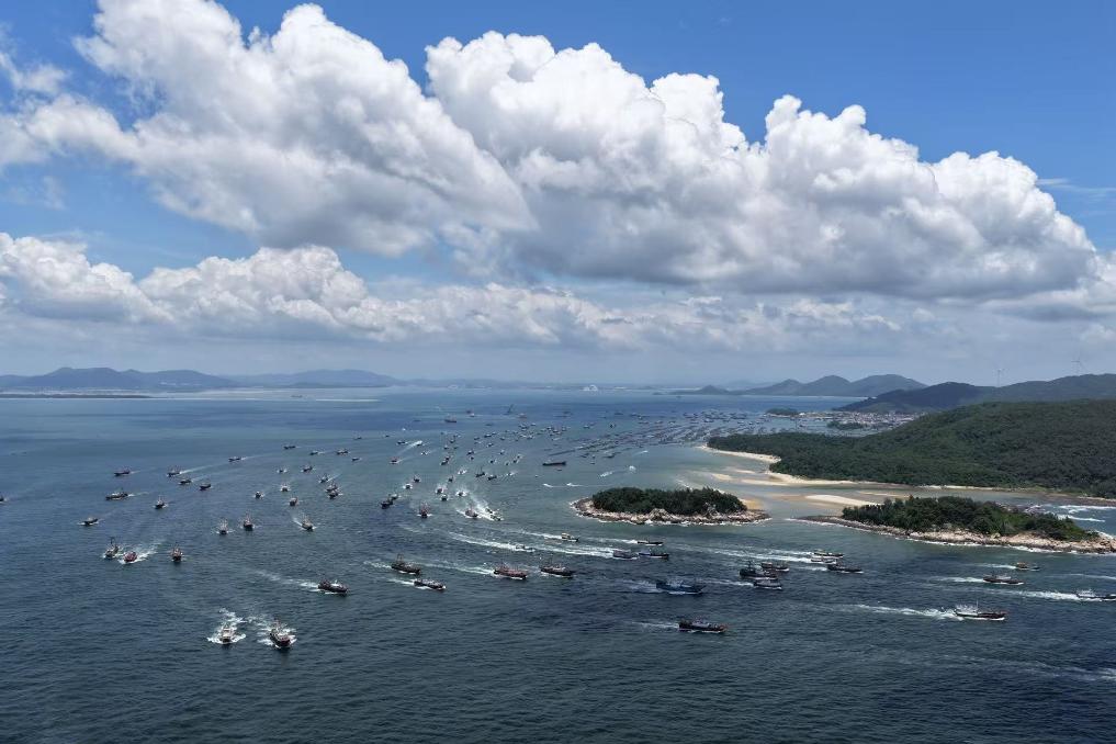 16日12時,響亮的開漁令宣告今年南海伏季休漁期結束。汽笛聲悠遠嘹亮、歡呼聲此起彼伏,在陽江超3400艘漁船駛向沉寂了三個半月的南海漁場。