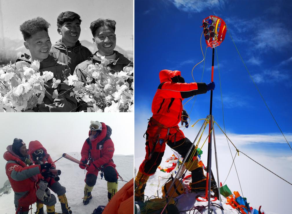 拼版照片:左上圖為1960年5月登上珠穆朗瑪峰頂的中國登山隊隊員王富洲(右)、貢布(中)和屈銀華(資料照片 新華社發);左下圖為2008年5月8日,北京奧運圣火珠峰傳遞登山隊隊員羅布占堆(左)點燃第一棒火炬手吉吉手中的“祥云”火炬(新華社發);右圖為2020珠峰高程測量登山隊隊員在珠穆朗瑪峰峰頂開展測量工作(2020年5月27日新華社特約記者扎西次仁攝)。新華社發