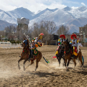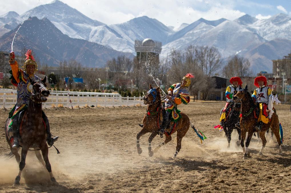 3月2日,2025年藏歷新年初三民族傳統馬術表演暨民族賽馬活動在拉薩市北郊賽馬場舉行。圖為馬術隊員在表演后慶祝。新華社記者 姜帆 攝