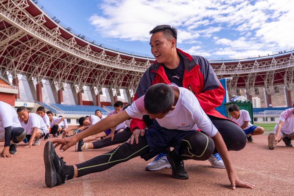 資料圖片:2019年6月22日,摔跤奧運冠軍張小平和競走奧運冠軍王麗萍在西藏自治區拉薩市文化體育中心為拉薩市業余體校的小運動員們上了一節訓練課。圖為拳擊奧運冠軍張小平正在指導小運動員的壓腿動作。新華社記者 孫非 攝