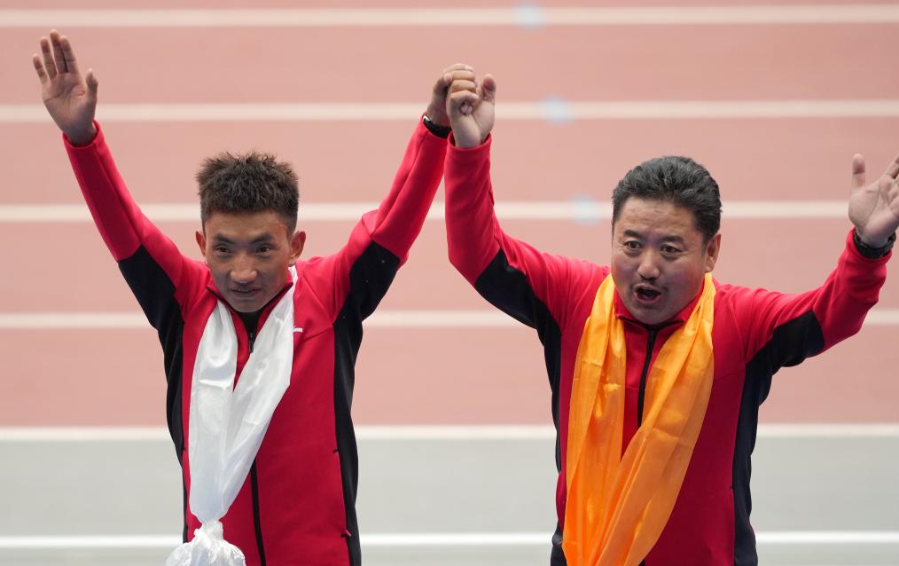 2021年9月23日,西藏隊選手多布杰(左)在第十四屆全運會田徑項目上,以13分49秒16的成績奪得男子5000米冠軍。圖為他和教練員在頒獎儀式上。新華社記者 李一博 攝