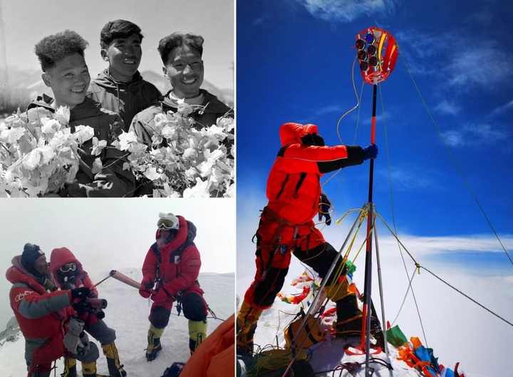 拼版照片:左上圖為1960年5月登上珠穆朗瑪峰峰頂的中國登山隊隊員王富洲(右)、貢布(中)和屈銀華(資料照片,新華社發);左下圖為2008年5月8日,北京奧運圣火珠峰傳遞登山隊隊員羅布占堆(左)點燃第一棒火炬手吉吉手中的“祥云”火炬(新華社發);右圖為2020珠峰高程測量登山隊隊員在珠穆朗瑪峰峰頂開展測量工作(2020年5月27日,新華社特約記者 扎西次仁 攝)