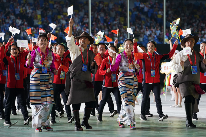 第十四屆全運會開幕式,西藏自治區體育代表團在入場儀式上(2021年9月15日攝)。新華社記者 彭子洋 攝