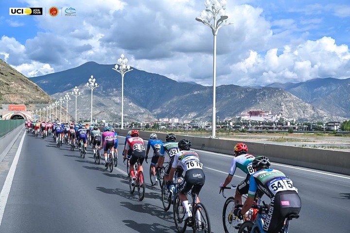 2025中國西藏第六屆跨喜馬拉雅國際公路自行車極限賽,選手在第三階段拉薩站比賽中。(主辦方供圖)