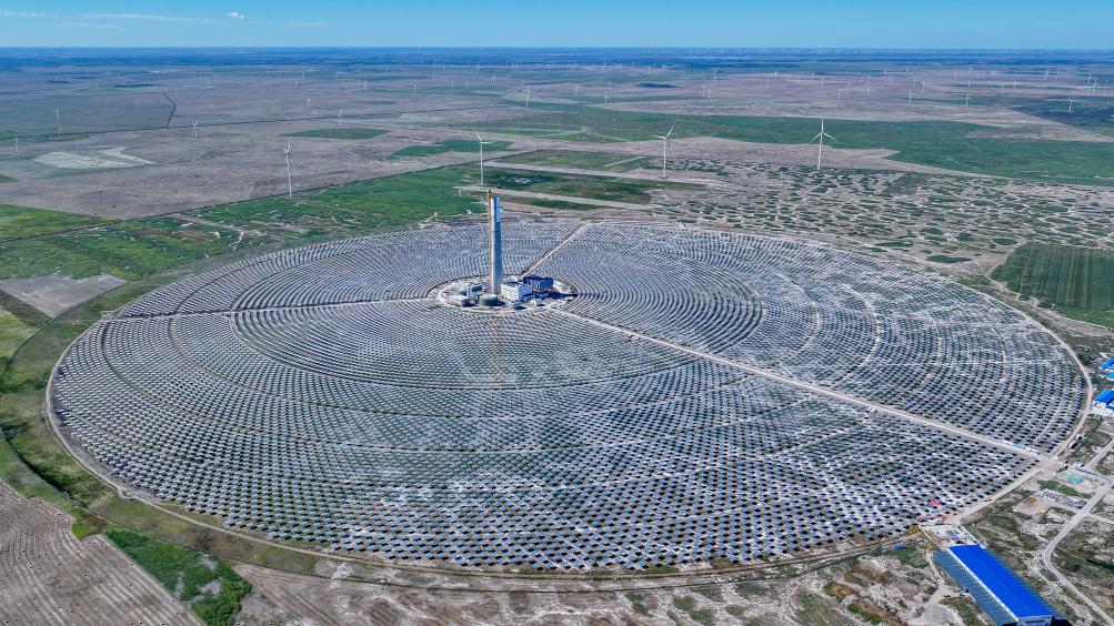 這是位于吉林省大安市的魯固直流100MW熔鹽塔式光熱電站。新華社發