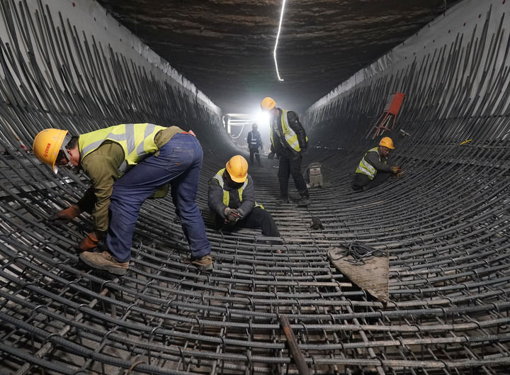 工人在北京軌道交通22號線紅廟站建設現場施工作業。新華社記者張晨霖 攝