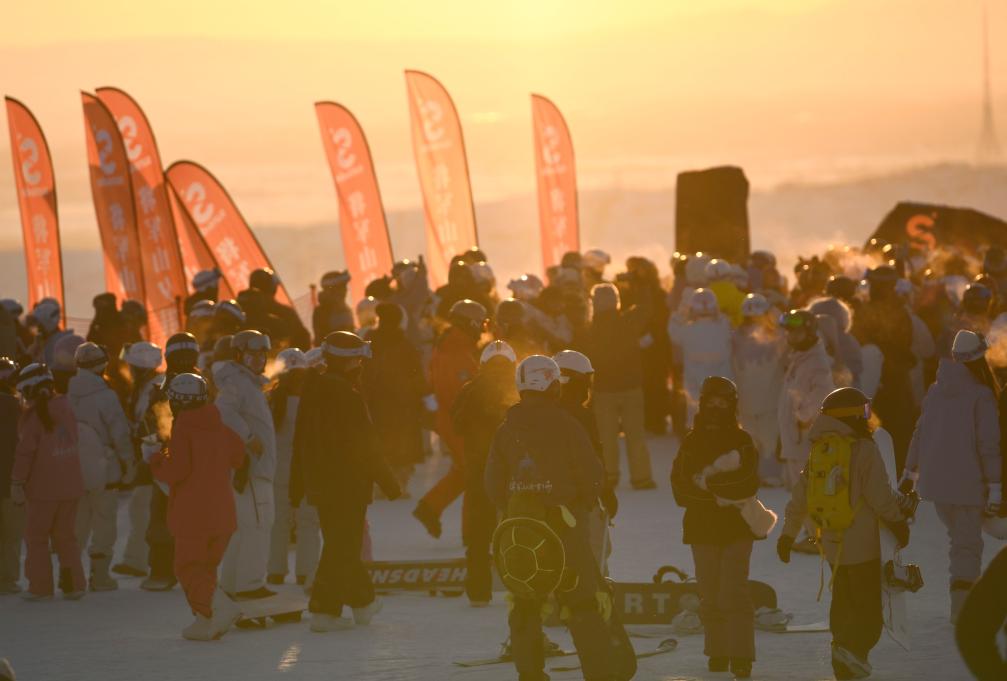 日落時分,阿勒泰市將軍山國際滑雪度假區的山頂區域人頭攢動(2025年1月24日攝)。新華社記者 胡虎虎 攝