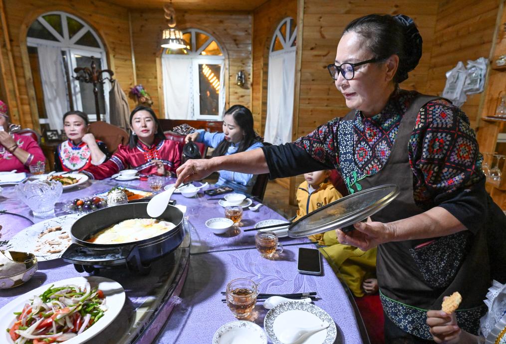 9月17日,一名客人在拍攝塔城地區特色的俄式風味大列巴。