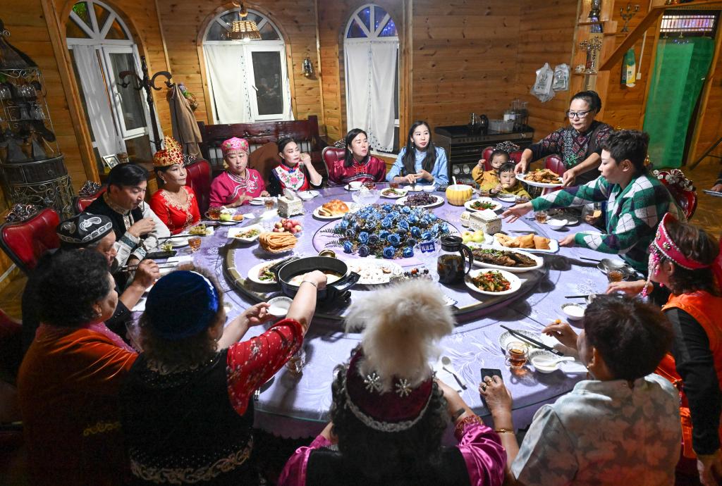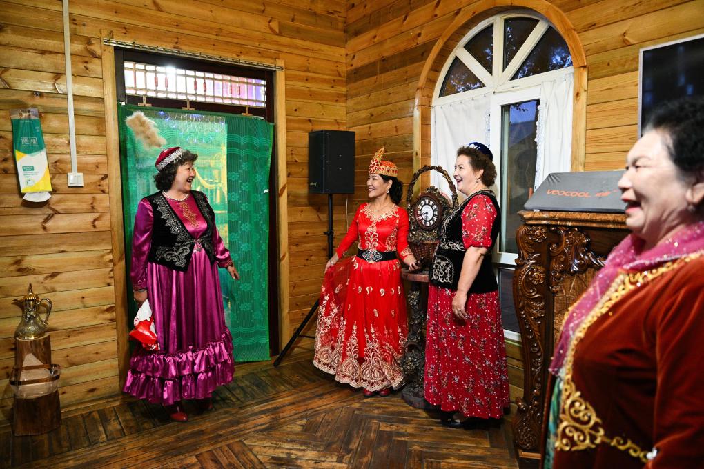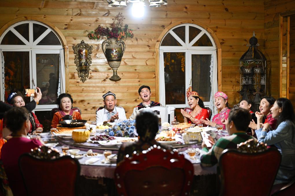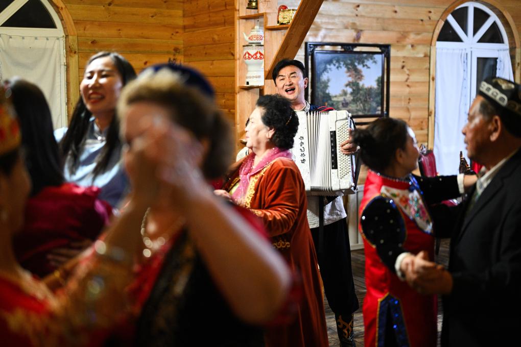 9月17日,哈薩克族客人哈加依甫·也克斯漢在餐后拉起手風琴,人們隨琴聲起舞。