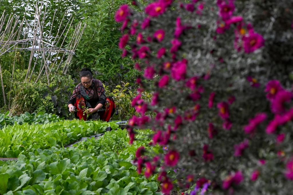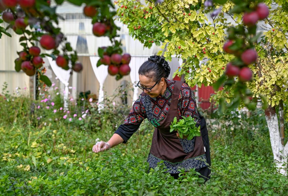 9月17日,馬秀花在菜園里采摘薄荷,用于制作薄荷茶。