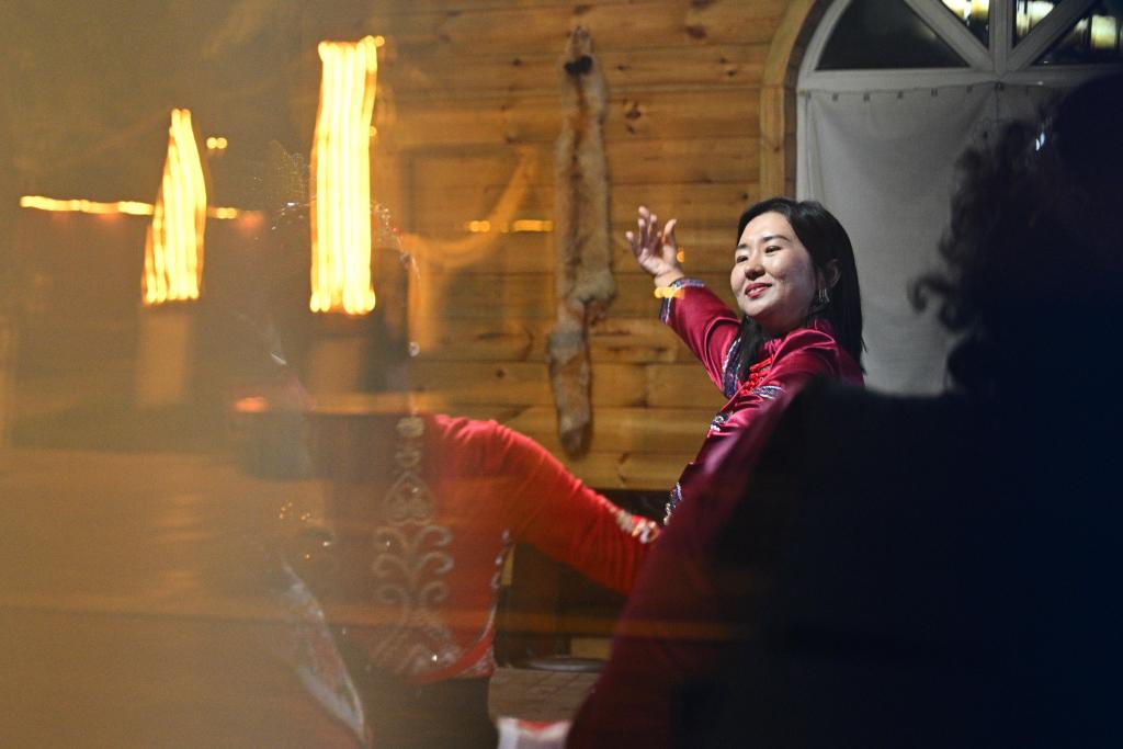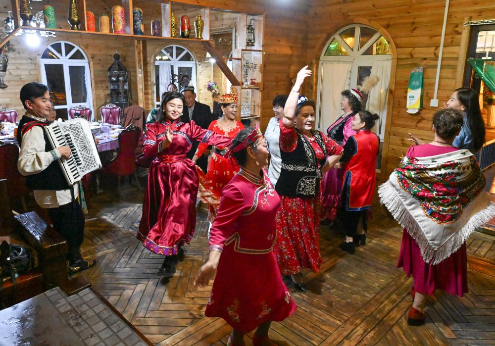 9月17日,達斡爾族客人宋瑞琪在餐后跳舞。