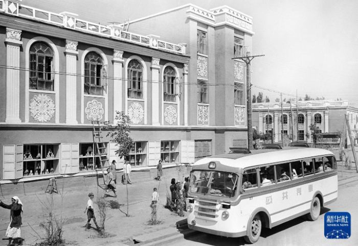 行駛在伊寧市區的公共汽車。(1964年8月30日發)
