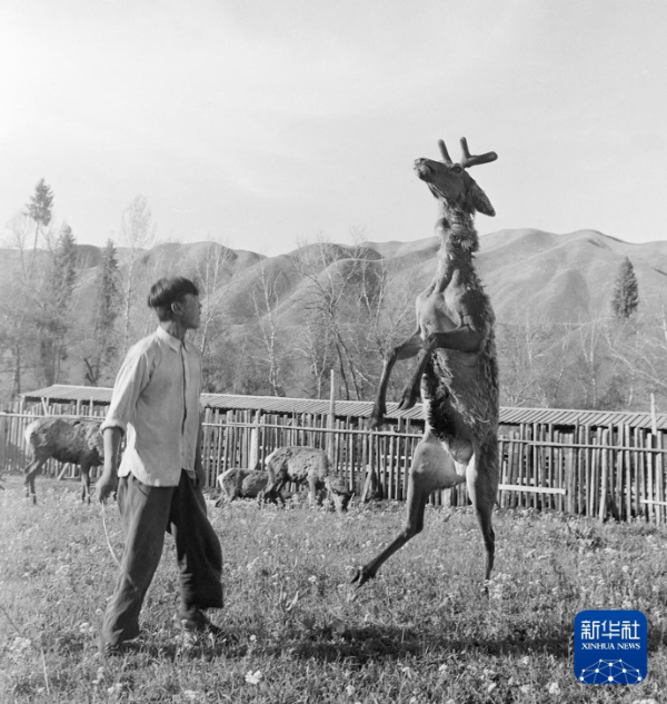 在新疆伊犁哈薩克自治州的一家養鹿場,一名莽撞的小伙子想去騎鹿,遭到了抗拒。(1963年6月26日發)