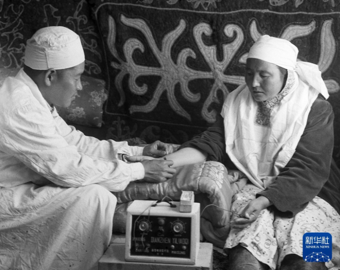 1962年,新疆博爾塔拉蒙古自治州醫院派出的巡回醫療組醫生正在為哈薩克族婦女看病。