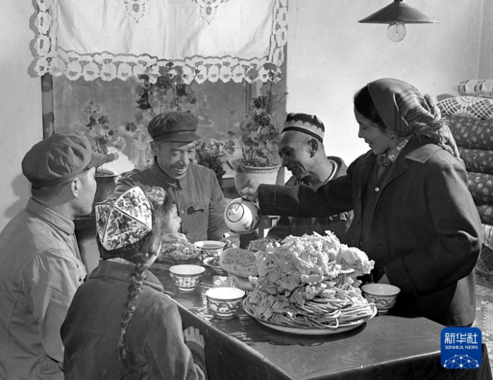 一名維吾爾族礦工在假期邀請漢族朋友到家中做客。(1972年3月6日發)