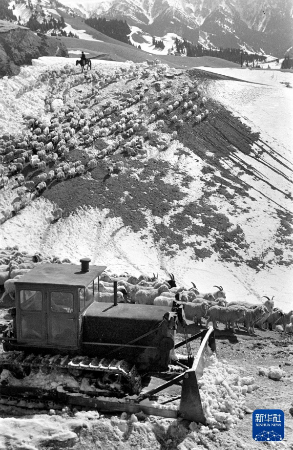 伊犁新二臺路段的養路工開來推土機為牧民清雪開路,使畜群安全順利地通過果子溝牧道。(1973年4月17日發)