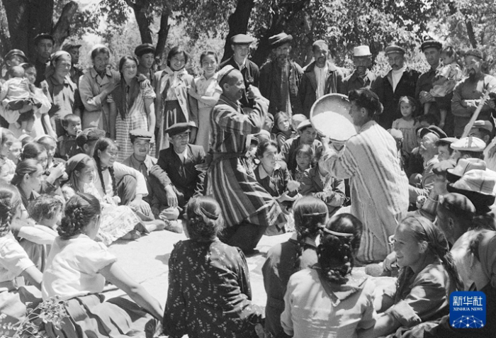 1963年,在伊犁哈薩克自治州伊寧縣,各族人民一起歡慶豐收。