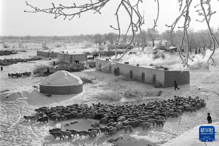 在新疆阿勒泰額爾齊斯河冬牧場上,為便于牧民從事冬季牧業生產,每隔一定距離就設置有這樣的一個居民點。(1965年2月22日發)