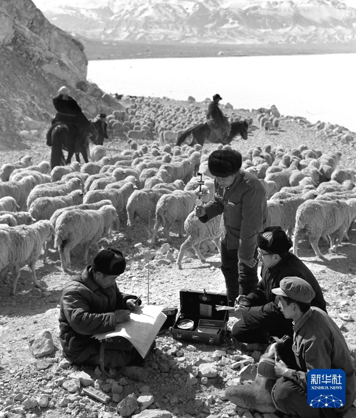 氣象工作者在牧道沿線觀測天氣,做好氣象預報,預防暴風雪對牧民和畜群的侵害。(1973年4月17日發)
