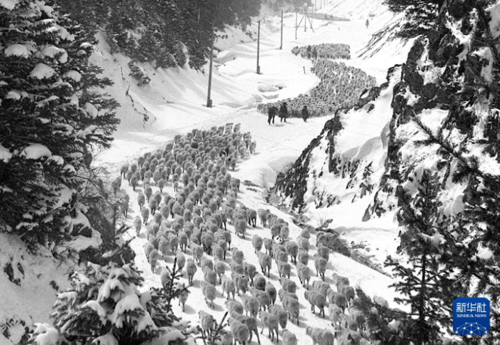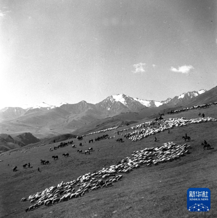 一群群肥壯牲畜,在牧民的精心護理下,順利通過風雪線,走向伊犁河谷春牧場。(1964年4月13日發)