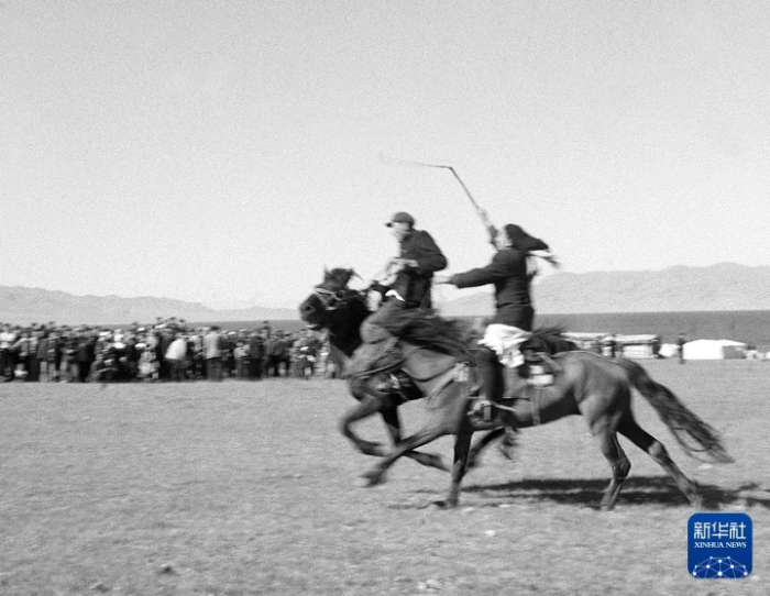 1962年7月中旬,在賽里木湖畔舉行的草原運動會上,歸來途中姑娘縱馬揮鞭催促小伙子快跑。