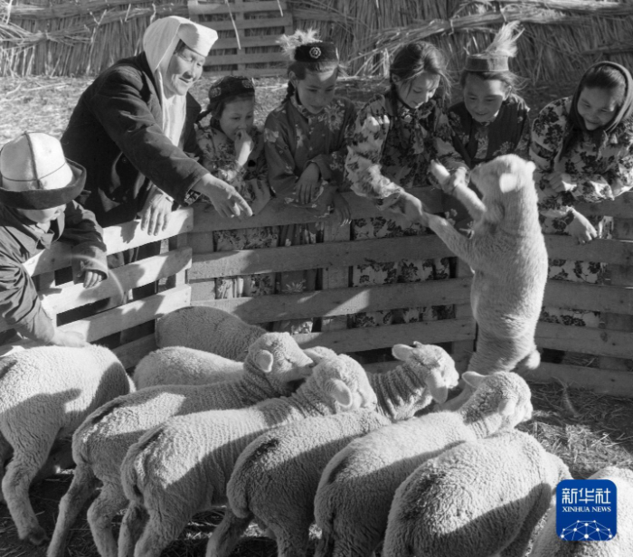 新疆鞏乃斯種羊場職工子弟小學的學生在全國勞動模范阿不都阿郎的羊舍參觀。(1963年5月25日發)