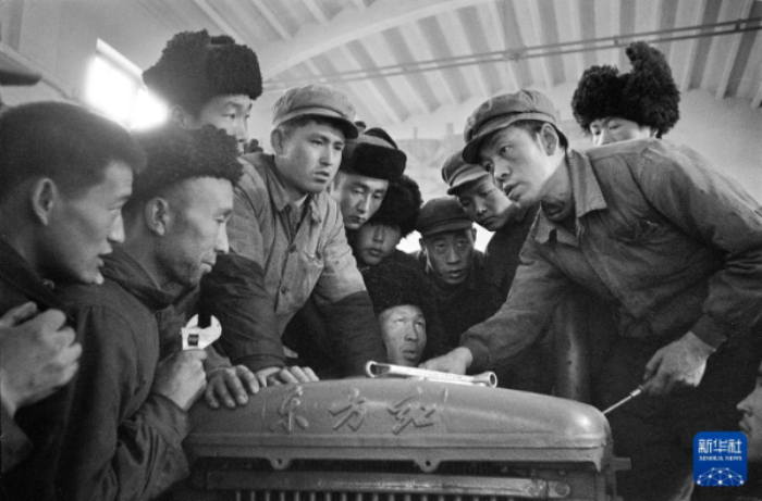 新疆阜康的一家拖拉機修配廠的工人在向拖拉機駕駛員講解機械修理技術。(1972年3月22日發)