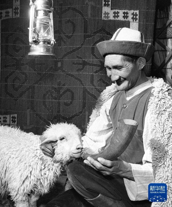 新疆阿克陶縣的一位柯爾克孜族牧民正在精心照料羔羊。(1974年8月8日發)