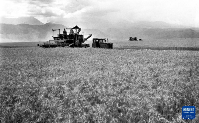 伊犁墾區農場職工正在天山腳下收割小麥。(1965年9月21日發)