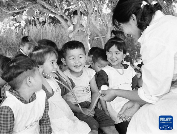 1964年,在新疆伊犁哈薩克自治州鞏留縣,縣醫院的醫生定期來幼兒園給孩子們做體格檢查?!拔逡弧庇變簣@里有哈薩克族、維吾爾族、漢族、回族等民族的兒童在一起愉快地生活。