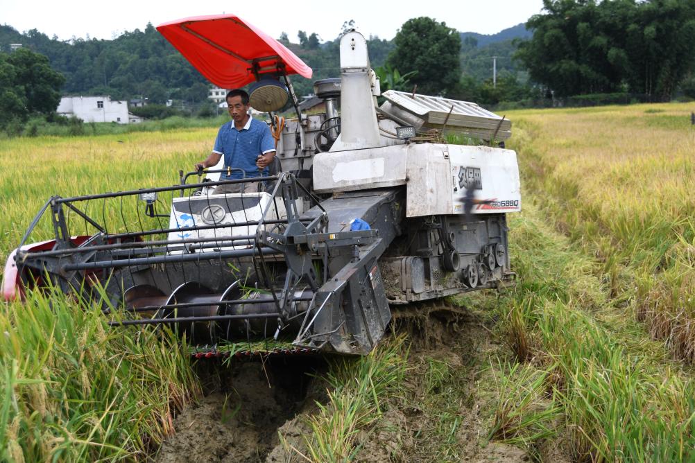 記者見到宜賓市興文縣五星鎮金鐘村種糧大戶何橋時,一臺收割機剛剛完成作業,他種植的水稻田幾乎已經收割完畢。